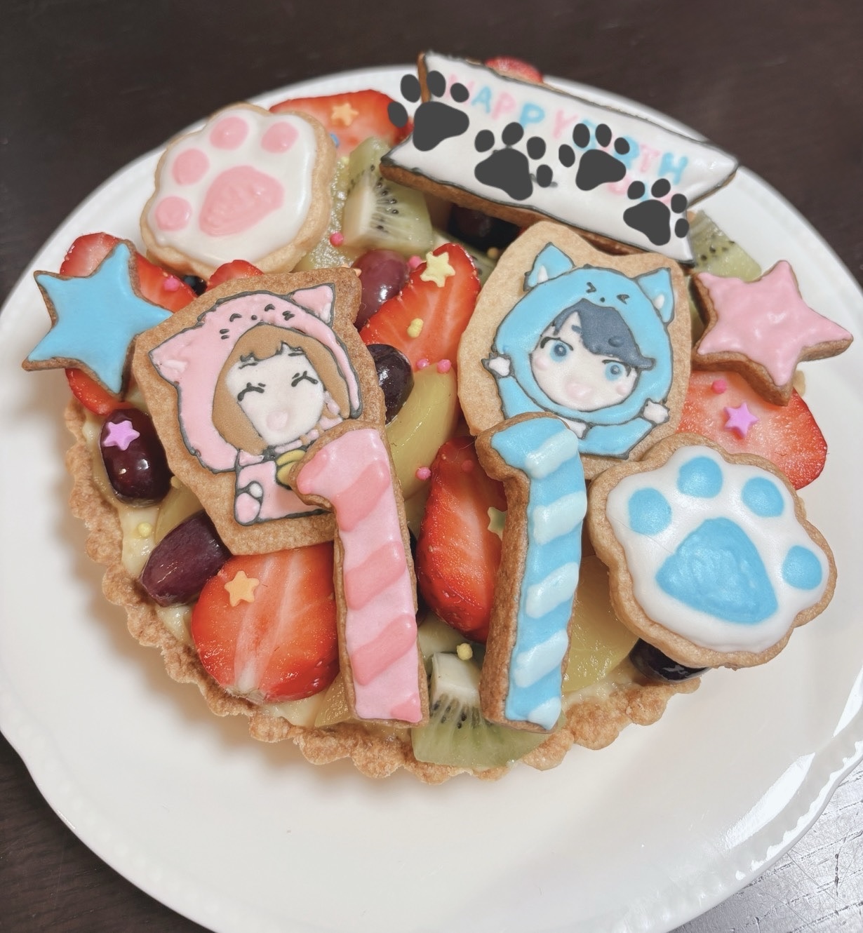 お気に入りのキャラクターのクッキーを乗せた、フルーツタルトを作ってお祝いしました🎂